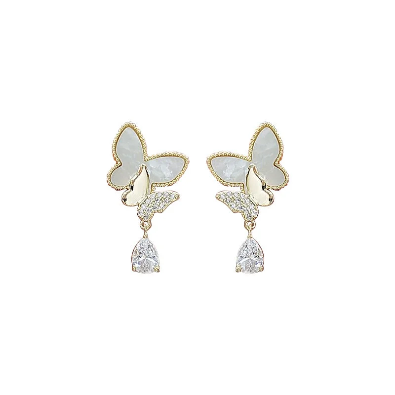Double Butterfly Hanging Pearl Earings | Colour Silver Golden Elevate your elegance with the enchanting Golden Wings Earrings, a perfect blend of grace and sparkle. These delicately crafted earrings feature shimmering butterfly motifs with mother-of-pearl inlays, framed in radiant gold tones. Each wing is accented with dazzling cubic zirconia and a teardrop-shaped crystal that gently sways with every movement, capturing the light from every angle.