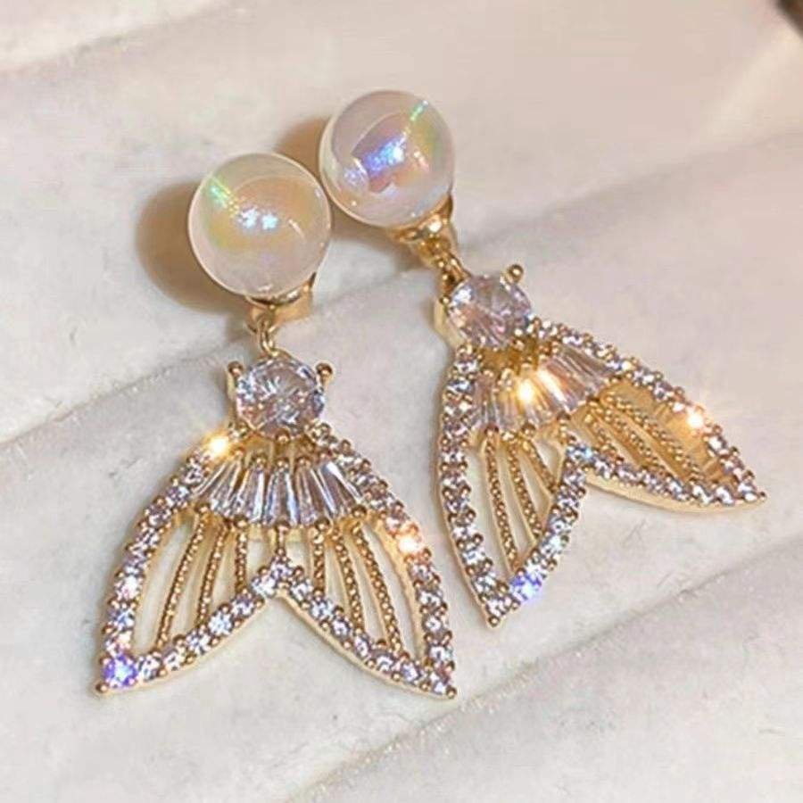Fishtail Luxury Sparkling Crystal Rhinestones Golden Zircon Pearl Earrings for Women